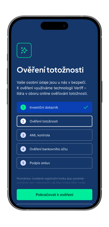 Následně si ověříme vaši totožnost, zeptáme se na vaše finanční zázemí a zkušenosti s investováním, podepíšete smlouvu a ověříte váš bankovní účet.